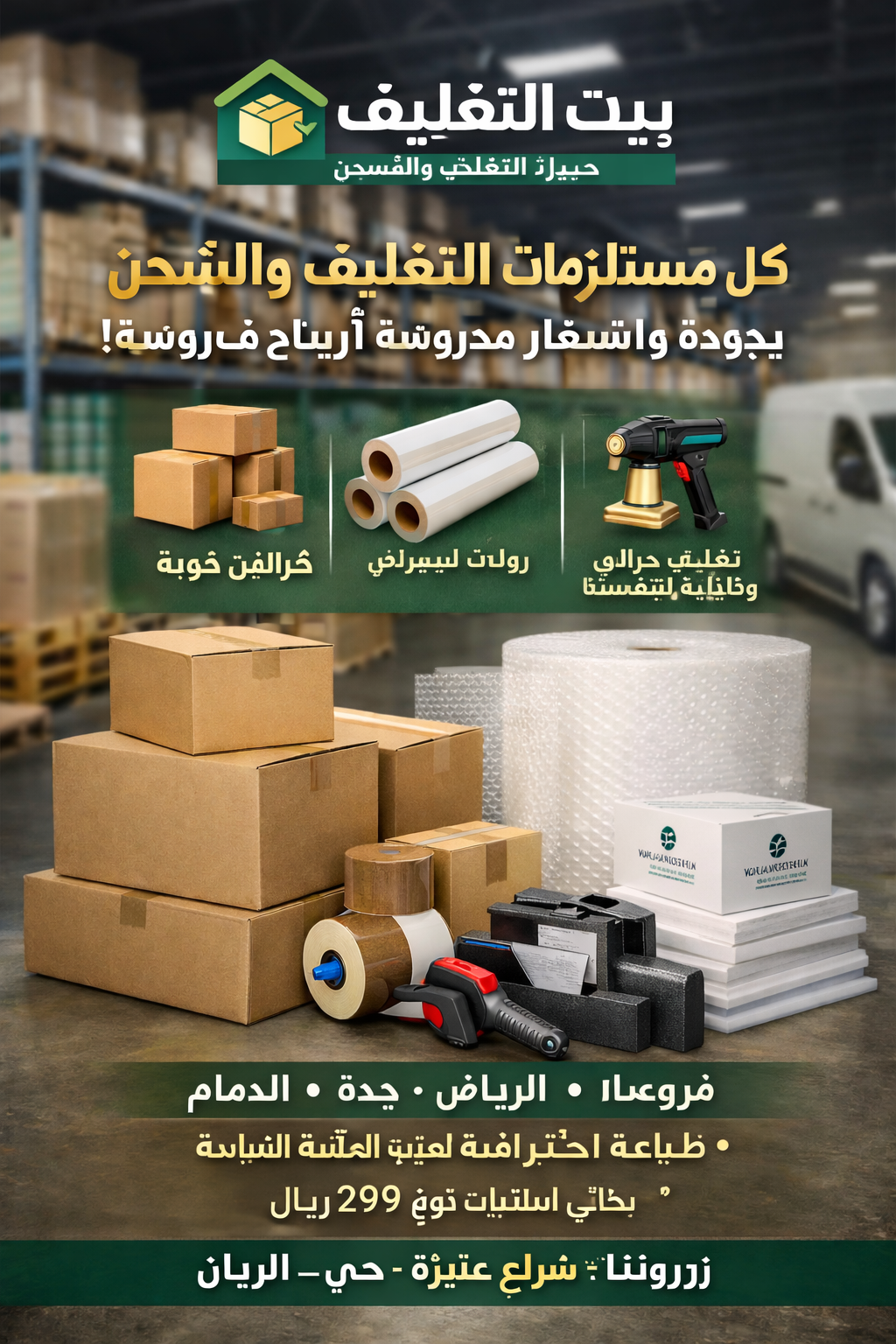 إذا كنت تبحث عن شركة موثوقة توفر لك كل ما تحتاجه من مستلزمات التغليف والشحن بجودة عالية وسعر مدروس يرفع أرباحك ويقلل خسائرك، فإن بيت التغليف هو خيارك الذكي. نحن لا نبيع منتجات فقط، بل نقدم حلولاً متكاملة تساعد أصحاب المتاجر الإلكترونية، شركات الشحن، المصانع، والمستودعات على حماية منتجاتهم وتعزيز صورتهم أمام العملاء. لأن التغليف الاحترافي لم يعد رفاهية، بل عنصر أساسي في نجاح أي نشاط تجاري. نوفر تشكيلة واسعة من الكراتين بمختلف المقاسات والسماكات المناسبة للشحن والتخزين، إضافة إلى رولات الاسترتش والنايلون الشفاف لحماية البضائع من الرطوبة والغبار، ومواد التغليف الحراري والفقاعات الهوائية (البابل راب) لحماية المنتجات القابلة للكسر. كما نوفر فوم الحماية، أشرطة اللصق عالية التحمل، وأكياس التعبئة بجودة تضمن ثبات الشحنة حتى وصولها بأمان تام. كل منتج لدينا تم اختياره بعناية ليحقق أعلى معايير الأمان والمتانة. ولأن الهوية التجارية أصبحت جزءاً من تجربة العميل، نقدم خدمة الطباعة على مواد التغليف باحترافية عالية، سواء طباعة شعارك على الكراتين أو الأكياس أو مواد التعبئة المختلفة، مما يعزز حضور علامتك التجارية ويمنح نشاطك طابعاً احترافياً يزيد من ثقة العملاء ويرفع معدل إعادة الشراء. بيت التغليف يخدم الأفراد والشركات عبر فروعه في الرياض، جدة، الدمام مع سرعة استجابة وتنفيذ فوري للطلبات. كما نوفر توصيل مجاني للطلبات فوق 299 ريال لتقليل التكاليف التشغيلية عليك وتحقيق أفضل عائد ممكن. نحن ندرك أن كل ريال يتم توفيره في التغليف ينعكس مباشرة على هامش ربحك. سواء كنت صاحب متجر إلكتروني تبحث عن مورد ثابت وموثوق، أو شركة شحن تحتاج إلى كميات كبيرة بأسعار منافسة، أو حتى فرداً يرغب في تغليف أثاث أو بضاعة للنقل، ستجد لدينا الحل المناسب. فريقنا جاهز لمساعدتك في اختيار المواد الأنسب لطبيعة منتجك لضمان أفضل حماية وأقل تكلفة. زورونا في شارع عنيزة – حي الريان – الرياض، أو تواصل معنا اليوم لطلب عرض سعر مخصص. ابدأ الآن بتطوير طريقة تغليف منتجاتك وامنح عملاءك تجربة احترافية من أول نظرة، لأن التغليف القوي يعني سمعة أقوى ومبيعات أعلى.